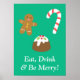 Celebre este Natal com estas belas guloseimas de Natal como o Gingerbird Man, Red and White Candy Cane, tradicional pudim de Natal decorado com Holly. O texto diz "Coma, Beba e Seja Feliz!" A comida é apenas o universo e parece tanto às crianças como aos adultos! Uma saudação deliciosa para a época festiva e festiva! Faz uma bela peça central para as decorações de Natal.