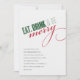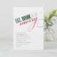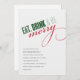 Este convite para festas de férias inclui a expressão "comer, beber e ser feliz" na tipografia elegante moderna. As palavras são verdes e vermelhas e o convite é feito em fundo branco. Os detalhes da sua parte são exibidos abaixo no texto da cinza