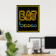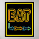 A arte retrô do EAT baseada num cartaz de restaurante neon vintage. As letras são amarelas e vermelhas, as setas são azuis, vermelhas e amarelas. Arte de publicidade divertida para pessoas que cozinham ou comem.