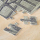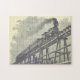 Este quebra-cabeça de estilo vintage apresenta uma representação de uma antiga locomotiva e comboio numa ponte ferroviária.