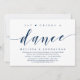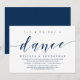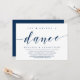 Tema azul marinho clássico e moderno, cartão de convite de casamento íntimo (Comer, Beber e Dançar). É perfeito para a sua celebração casual de casamento às margens de um lago.