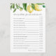 Teste o conhecimento de seus convidados com este charmoso cartão de jogo "Como você conhece a noiva?", com limões de aquarela elegantes e verde-claro. Perfeito para chás de panela, solteiros ou festas de noivado. Este jogo de na moda e diversão é totalmente editável e disponível impresso ou como download digital. Um encantador aditamento a qualquer celebração de citrinos ou jardins de Redwood & Vine Design Co.