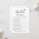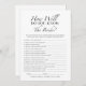 Apresentando o cartão de jogo "Como você conhece a noiva?", um na moda adicional a qualquer chá de panela! Apresentando um design preto e branco minimalista, este cartão de jogo convida os convidados a testar seu conhecimento sobre a noiva de uma forma divertida e envolvente. Perfeito para criar momentos memoráveis e risos, ajustado perfeitamente em qualquer tema de chá de panela. Projetado pela CaMiDesigns, este cartão de jogo é uma forma encantadora de celebrar a noiva a ser. Para obter assistência com pedidos, envio, informações sobre produtos e muito mais, entre em contato diretamente com o Atendimento ao Cliente da Zazzle.