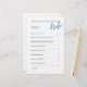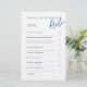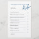 Este elegante jogo de chá de panela é uma maneira divertida de celebrar a noiva-a-ser! Apresentando um roteiro azul clássico e um layout minimalista suave, os hóspedes vão gostar de responder 15 perguntas pessoais triviais para ver quem conhece melhor a noiva. 💍 Dupla face, 💙 Coordenando com nossa coleção de "Pop a Borracha", ✨ Perfeito para chás de panela, solteiros e brunches