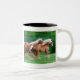 Pares de cavalos do palomino que galopam em uma raça através de uma caneca de café cerâmica do campo.