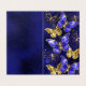Composição de borboletas luxuosas de safira e joias de ouro em fundo azul texturizado.
