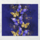 Composição de borboletas luxuosas de safira e joias de ouro em fundo azul texturizado.