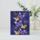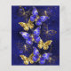 Composição de borboletas luxuosas de safira e joias de ouro em fundo azul texturizado.