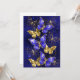 Composição de borboletas luxuosas de safira e joias de ouro em fundo azul texturizado.