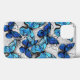 Composição vertical de borboletas de morfo realistas, azuis e brancas sobre fundo texturizado de cinzas. Borboleta azul Morpho.