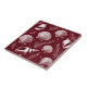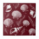 Azulejo cerâmico num padrão de conchas e padrões delicados de algas, dispostos sobre fundo vermelho de marrom profundo, criando um contraste impressionante. O trabalho detalhado acrescenta à composição uma sensação intrincada e naturalista.