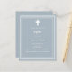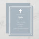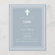 Fundo azul empoeirado, decorado com um quadro branco, e uma cruz branca Personalize e adicione o nome e os detalhes. Texto branco.