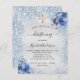 Um batismo moderno e elegante, celebrando um menino. Fundo com aspecto fino prateado decorado com brilho azul e flores. Uma cruz ouro. Personalize e adicione um nome e detalhes da parte. Letras pretas coloridas.