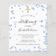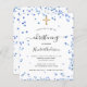 Um batizado moderno e elegante, batismo, celebrando um menino. Um fundo branco decorado com corações azuis e uma cruz ouro. Personalize e adicione um nome e detalhes da parte. Letras pretas coloridas.