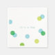 Estes guardanapos de papel festivo apresentam pontos aqua azuis esparsos e verdes confetti em um fundo branco com azul aqua "é um menino" editável. Perfeito para um bebê revelar chá.