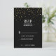 Este convite de RSVP de aniversário de casamento preto com confete dourado é perfeito para uma festa de aniversário de casamento elegante. O design apresenta confete com brilho dourado em um fundo preto com caligrafia branca.