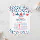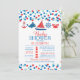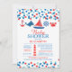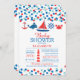 Chá de fraldas náutico de confete moderno para um menino. O nosso chá de fraldas de meninos contemporâneos e divertidos convida a apresenta uma confete vermelho e vermelho brilhante em um fundo branco com um veleiro vermelho e azul, baleia, roda de navio, âncora e caranguejo e um farol.