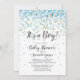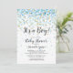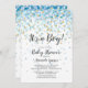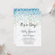 Elegante falso Dourado e azul Confetti É um convite para Chás de fraldas de Menino com tipografia na moda. Sacudir nosso convite para ver uma correspondência de volta para um toque especial. Fácil para você personalizar com suas informações de chá.