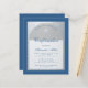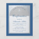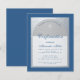 Um convite de confirmação de orçamento para menino. Sobre um fundo retangular azul clássico, há um arco de folha de prata falsa que contém texto azul em fundo branco. A palavra Confirmação e o nome estão escritos em uma fonte caligráfica elegante; a primeira linha é um texto arqueado.