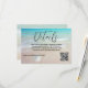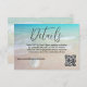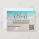 Cartão de detalhes do casamento com tema de praia e opção de resposta online. Script moderno "detalhes" (ou RSVP) no topo com um parágrafo de texto impresso e espaço para url do site conforme necessário. Inclua um código QR para que os convidados acessem facilmente um local de resposta, ou você pode excluir a imagem do código na ferramenta de design - "personalizar mais". Água azul tropical e areia da praia são o fundo com um pequeno dólar de areia branco.