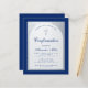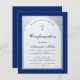 Um convite de confirmação de orçamento. Em fundo retangular azul real, ele tem um arco azul-prateado falso que tem texto azul-dentro sobre fundo branco. A palavra Confirmação e o nome são escritos num script caligráfico elegante; a primeira linha é texto arquivado.