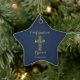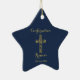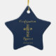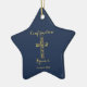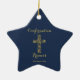 Confirmação moderna ornamento dourado com nome cruzado estrelado com fundo azul. Personalize com seu nome e data.