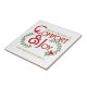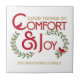 Este azulejo cerâmico tem cores tradicionais de Natal vermelho, verde e dourado. Personalize-o com seu nome ou texto na modelo. A design da tipografia vintage lê "Bons Tidings of Comfort and Joy", cercada por galhos sagrados curvos, bagas e dois cardeais vermelhos. O texto vermelho e as folhas verdes ocas têm um contorno dourado. Faz um presente de Natal excelente e útil.