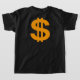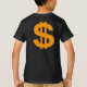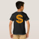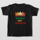 A camiseta do garoto com as palavras "Conhece minha riqueza" em cores africanas, com uma coroa ouro no topo. A parte de trás apresenta um sinal dourado.