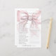 Esse jogo de Chá de panela do estilo gira e coquete - Como você conhece a noiva? Adicione uma atividade divertida ao seu chá de panela onde os convidados respondam a uma série de perguntas para ver quão bem eles conhecem a noiva. É uma maneira divertida de despertar risos e conversas enquanto a celebra. O design apresenta um arco cor-de-rosa pincelado e sobredimensionado, emparelhado com a frase "Ela é casando!" em uma combinação chic de script manuscrito preto e fontes serif clássicas. A tipografia melhora o charme de coquetes, combinando uma escrita graciosa com texto de serifa de eterno para uma aparência feminina e na moda. Totalmente personalizável, você pode editar as perguntas, as cores da fonte e o plano de fundo para corresponder ao tema do chá de panela. Essa atividade adiciona um toque doce e engajador a qualquer celebração. Este jogo também é chamado de "jogo do calçado", onde noiva e noiva podem responder a perguntas segurando um calçado.