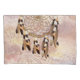 Um design de apanhador de sonhos com acabamentos em dourado e marrom que inclui um círculo de bambu redondo com teia da vida com penas em tons marrons e contas vermelhas sobre um fundo de penas macias.