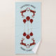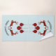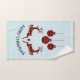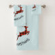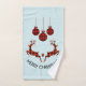 Um conjunto de toalhas que diz "Feliz Natal" em texto curvo. Projetado com uma ilustração de 2 cervos de Natal saltando. Os cervejeiros são feitos de xadrez vermelha e preta, com um pouco de coração entre eles. As decorações de natal de xadrez vermelha e preta penduram no topo. Fundo azul claro.