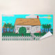 Casa com cerca perto da água da praia com árvores e flores por toda a parte. As configurações de montagem em segundo plano. Duas mulheres lá fora se exercitando enquanto uma mulher olha pela janela enquanto o rádio toca. O cão latido no flamingo que anda e o veleiro passa calmamente.