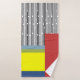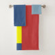 Este conjunto de toalhas tem um pano de lavagem azul claro, uma toalha azul-escura, e uma toalha de banho com um design de linhas pretas quebradas correndo verticalmente em retângulos de azul claro, verde, azul, amarelo e vermelho. Quer cores diferentes? Me mande mensagem.