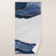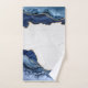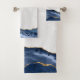 Este conjunto personalizado de toalhas de banheiro apresenta um design de pedra natural luxuoso. O fundo é um padrão de mármore de cinzas suaves. As toalhas de mão e banho têm agato azul marinho com acentos de brilho dourado falsos impressos em cada extremidade. O pano de lavagem tem o padrão de agate impresso em um lado.