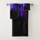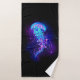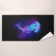 Água-viva grande, azul, desenhada artisticamente, brilhante, brilhante, com longos tentáculos sobre fundo preto com bioluminescência roxa. Água-viva luminosa.