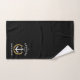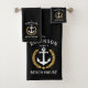 Personalize a sua casa de férias com um elegante conjunto de toalhas de banho náuticas com tema náutico que mostre o seu nome familiar, casa de praia, cabana ou outro texto desejado. Este design personalizado apresenta uma âncora de barco antiga, folhas de ouro com emblema de estrela em fundo preto real. A parte de trás do conjunto de toalhas é branca e você pode facilmente mudar a cor principal do lado frontal para corresponder ao seu decoro ou tema atual.