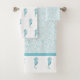 A casa de praia inspirou um conjunto de toalhas de banho, com trabalho de arte de um cavalo marinho aqua e um padrão de onda aqua. Adorável para o banheiro temático da praia e faz uma ideia de presente de excelente.
