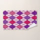 Este conjunto de toalhas tem um design de deco de arte de formas de diamante feitas de ângulos sobrepostos em linhas pretas coloridas em tons de roxo e cor-de-rosa com linhas pretas diagonais fazeres que o design se parece com argyle