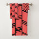 Este conjunto de toalhas tem um design de arte de linhas verticais ligadas por linhas diagonais em preto num campo de coral.