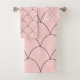 Bath towel set, consisting of a face cloth, hand towel and bath towel with an art deco design. You can customise this bath towel set with any text of your choice. Should you require any help with customising then contact us through the message link on this page. Art deco design bathroom towel set
