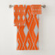 Este conjunto de toalhas tem uma design de arte deco de formas de diamante de cinza num campo de laranja.