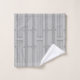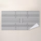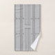 Este conjunto de toalhas tem um design de arte de linhas verticais com ouros e círculos em prata em um campo de cinzas.