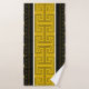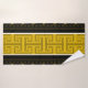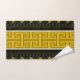 Este trabalho de arte de conjunto de toalhas de banho consiste em formas clássicas de linha chave grega intimamente relacionadas sobre um fundo de canvas preto e quente de mostarda amarela, com uma camada vertical de linha branca dupla que produz uma interação impressionante com o contraste.