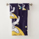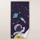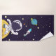 Uma toalha armada com fundo azul escuro com estrelas amarelas espalhadas ao redor. Camadas sobre o topo é uma ilustração de um homem espacial vestindo um traje astronauta branco flutuando sobre a lua. Ao longe está um planeta com anéis e um foguete voando para o céu procurando novos mundos para explorar.