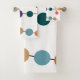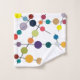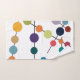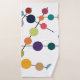 Este conjunto de toalhas tem uma design moderna do século médio de linhas pretas com círculos de diferentes cores e tamanhos num campo de branco.