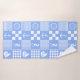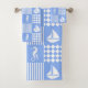 Conjunto de toalhas para casas de banho com padrão azul pálido, com cheques e faixas geométricas, bem como cavalos marinhos, embarcações à vela, âncoras e rodas de navios.