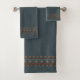 Bonitas, ricas, coloridas toalhas azuis escuras com uma faixa russa, nativa americana projetada em tons de azul, marrom, bronzeado e cinza. Este design asteca com padrão geométrico seria espantoso num banheiro do Sudoeste, num banheiro rústico ou até mesmo num banheiro contemporâneo! E há um conjunto coordenado de toalhas feitas inteiramente no padrão asteca na loja para uma aparência divertida, mesclada e de fósforo! Certifique-se de verificar a loja para muitos mais itens coordenadores para fazer o banheiro perfeito para designer!