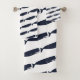A baleia azul marinho moderna silhueta o padrão sobre a branca. Estas toalhas fazem um excelente de um banheiro náutico!