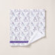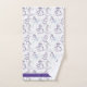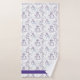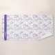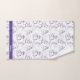 As cores de roxo e azul claro são usadas no fazer deste conjunto de toalhas de banho sem costura do boneco de neve. Ilustração desenhada à mão de um bonitinho bonitão com chapéu, cachecol e nariz de cenoura. Ele fica numa colina de neve perto de uma árvore de Natal com uma estrela. O texto "Feliz Natal!" está incluído em padrão em uma faixa de faixa branca e roxa.