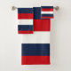 Este conjunto de toalhas do banheiro apresenta listras vermelhas azuis projetadas por deluxephotos.